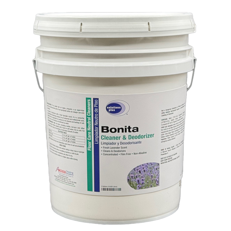 This highly concentrated, multi-purpose neutral cleaner and deodorizer removes a variety of soils from any surface not harmed by water, leaving surfaces sparkling clean and deodorized. Bonita is recommended for all types of floors including VCT, VAT, marble, ceramic and other stone surfaces and will not damage or dull the gloss of any floor finish. Clear Purple Liquid, Lavender Odor.