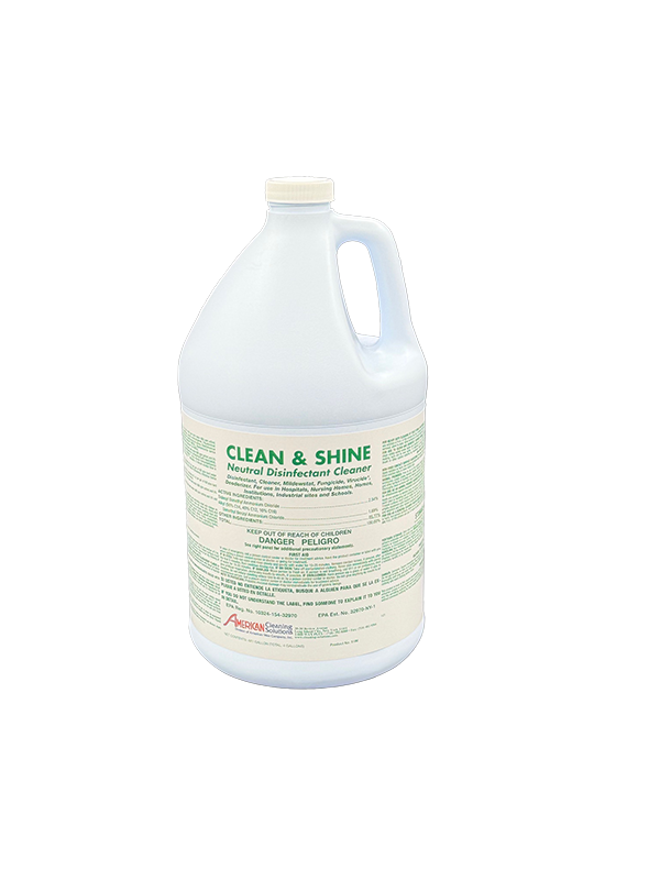 A neutral pH, highly concentrated, pleasantly scented quaternary formulation. Clean & Shine will not harm the floor finish or sealer. It is an extremely effective disinfectant, deodorizer, and cleaner specifically designed for use on hard, non-porous surfaces in health care facilities, hospitals, patient care rooms, shower rooms, locker rooms, food establishments, etc. This product kills Human Coronavirus, HIV-1, Herpes Simplex, Salmonella, Pseudomonas, Strep, MRSA etc. It is also an effective no-rinse sanitizer on hard, non-porous non-food contact surfaces.
