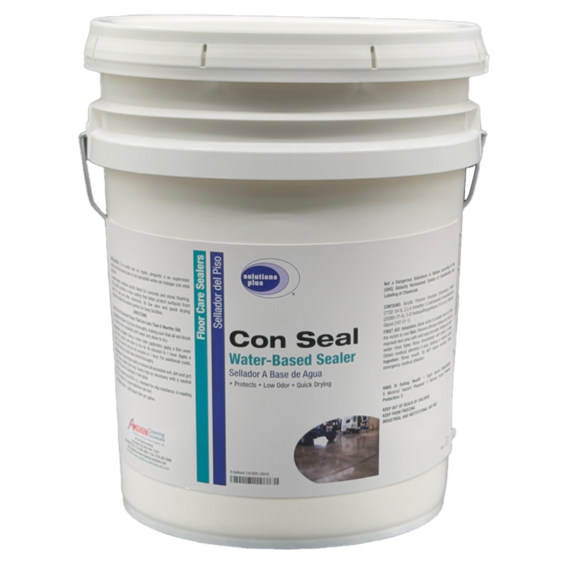 A water-based, urethane acrylic blend for concrete and stone surface flooring. Con Seal provides a clear coating that helps protect surfaces from water, oil, salt and other chemicals. Its low odor and quick drying properties make Con Seal perfect for busy facilities. Opaque, Off-White Liquid, Acrylic Odor.