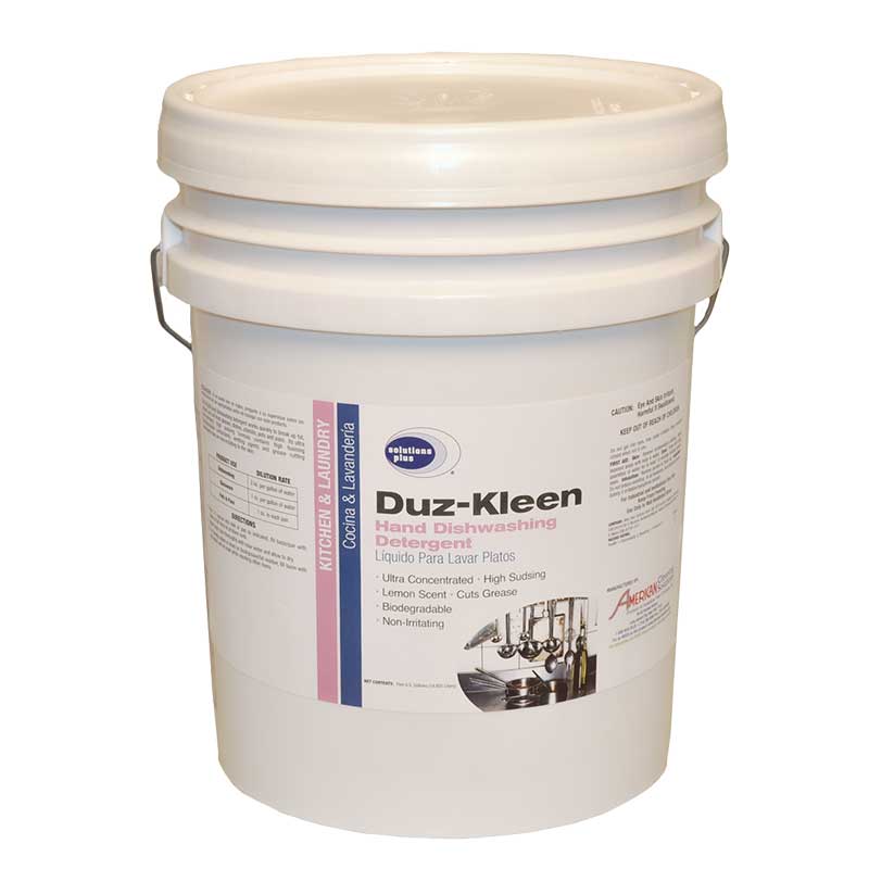 Duz-Kleen Hand Dishwashing Detergent works quickly to break up fat, grease and soil from glasses, dishes, utensils, pots and pans. Its ultra-concentrated, high sudsing formula contains high foaming biodegradable surfactants, wetting agents and grease cutting detergents that are non-irritating to the skin. Viscous Green Liquid, Lemon Odor.