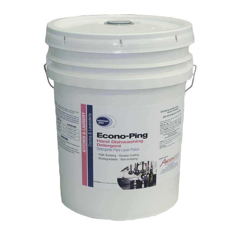 A concentrated, high sudsing, liquid hand dishwashing detergent formulated with high foaming biodegradable surfactants, wetting agents and grease cutting detergents. Ping is non-irritating to the skin and works quickly to break up fat, grease and soil from glasses, dishes, utensils, pots and pans.