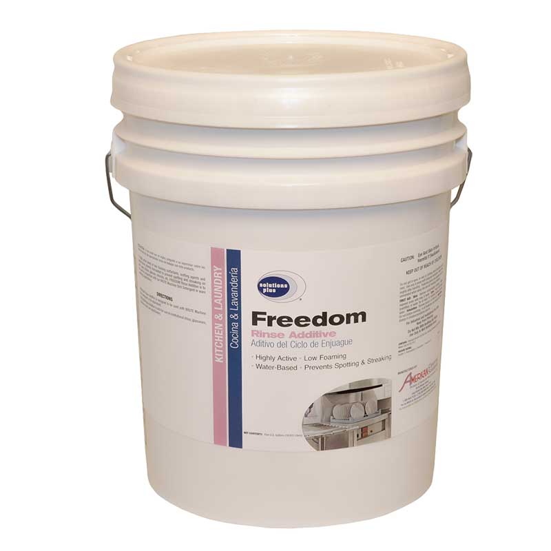 A highly active blend of low foaming surfactants, wetting agents and water-based solvents formulated to prevent spotting and streaking on pots, pans, dishes, glasses, utensils, etc. Freedom Rinse Additive is to be used in conjunction with our Brute Machine Dish Detergent in ware washing applications.