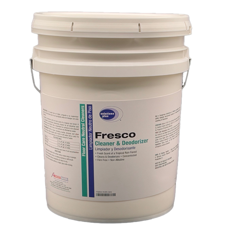This highly concentrated, multi-purpose neutral cleaner and deodorizer removes a variety of soils from any surface not harmed by water, leaving surfaces sparkling clean and deodorized. Fresco is recommended for all types of floors including VCT, VAT, marble, ceramic and other stone surfaces and will not damage or dull the gloss of any floor finish. Turquoise Blue Liquid, Tropical Rain Odor.