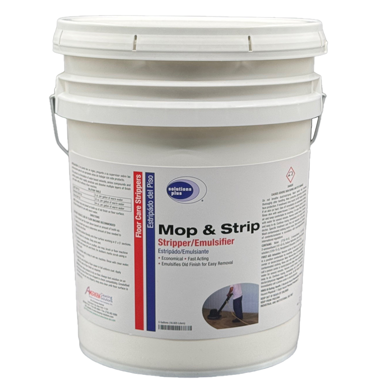An economical, fast acting, non-ammoniated stripper and emulsifier. Mop & Strip rapidly penetrates and dissolves multiple layers of finish with or without a floor machine. Blue Liquid, Butyl Odor.