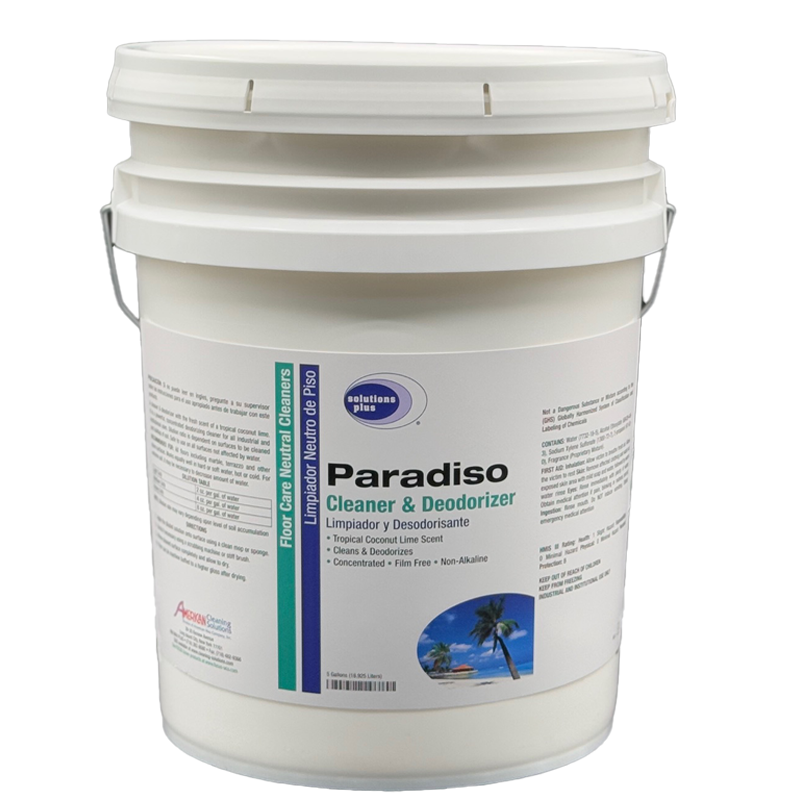 This highly concentrated, multi-purpose neutral cleaner and deodorizer removes a variety of soils from any surface not harmed by water, leaving surfaces sparkling clean and deodorized. Paradiso is recommended for all types of floors including VCT, VAT, marble, ceramic and other stone surfaces and will not damage or dull the gloss of any floor finish. Clear Yellow-Green Liquid, Coconut-Lime Odor.