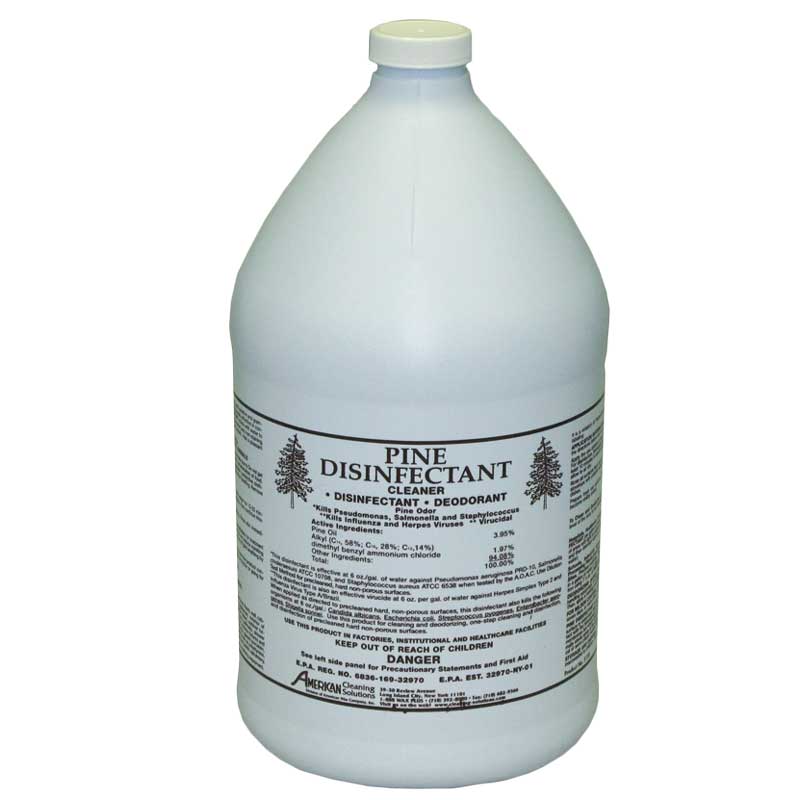 This formulation consists of pure pine oil, quaternary ammonium compounds, surfactants and cleaning agents. Pine Disinfectant is an extremely effective disinfectant, deodorizer and cleaner suitable for use in health care facilities, schools, food service areas, restrooms and most other public areas. This product will kill Pseudomonas, Salmonella, Influenza, Herpes Simplex, MRSA etc. Orange-Brown Liquid, Pine Odor.