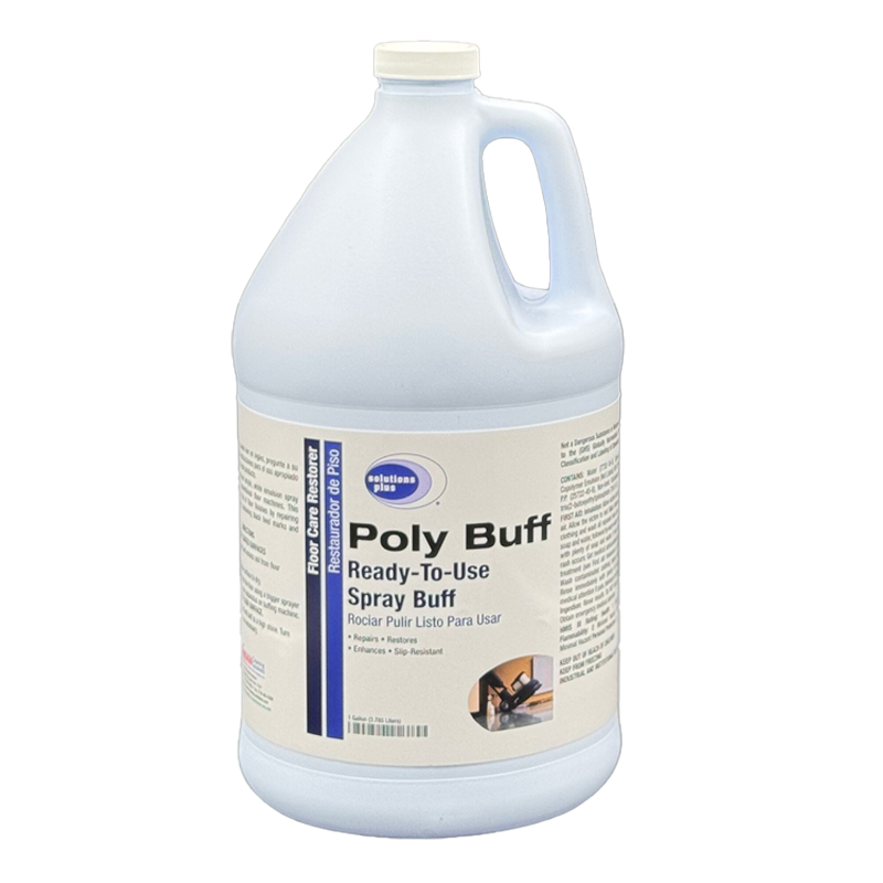 A ready to use, premium acrylic, white emulsion spray buff for use with conventional floor machines. Poly Buff extends the life of floor finishes by repairing scuffs and scratches, removing black heel marks, and restoring gloss.