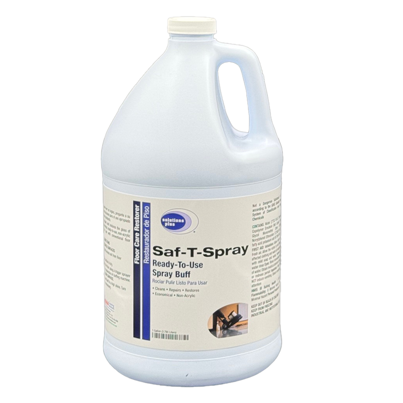 Saf-T-Spray cleans, repairs and restores the gloss of finished floors. An economical, ready-to-use, non-acrylic product formulated for use with conventional floor machines. Pink Liquid, Sassafras Odor.