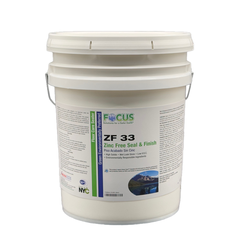 A high quality, low V.O.C., low odor, zinc free floor seal and finish. ZF 33 Zinc-Free Seal & Finish contains no heavy metals, formaldehyde, ammonia or nonylphenol surfactants. It exhibits a deep wet look gloss and it can be incorporated into any floor maintenance program. High levels of zinc have been found to be toxic to aquatic life. Opaque, Off-White Liquid, Acrylic Odor.
